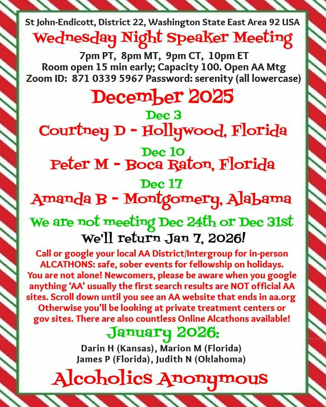 | 7:00 pm | St. John-Endicott Speaker Meeting |